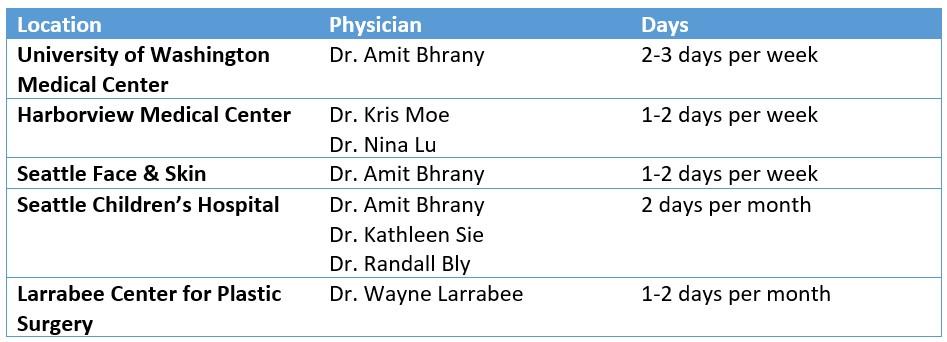 The fellow operates multiple days per week with Dr. Bhrany at UW Medical Center, his private practice, and two days a month are spent performing microtia reconstruction with Dr. Kathy Sie at Seattle Children’s Hospital. One to two days a week is spent operating at Harborview Medical Center with Drs. Kris Moe and Nina Lu. The fellow also has the opportunity to operate with Wayne Larrabee at the Larrabee Plastic Surgery Center and with local oculoplastic surgeons when the schedule permits. The fellow completes approximately 700-750 operative cases per year. The fellow graduates with a comprehensive experience that prepares for an academic faculty or private practice career in facial plastic and reconstructive surgery.