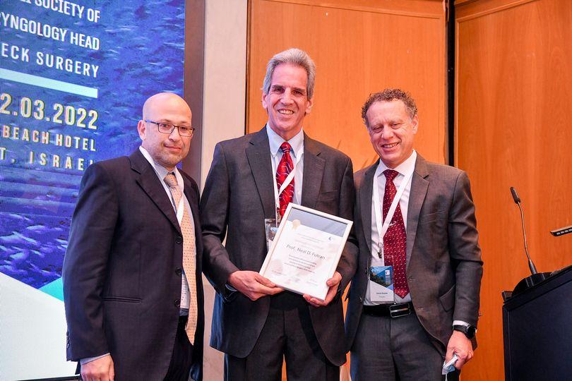 Neal Futran, MD, DMD, delivered a talk on advances in midface reconstruction at the 2022 Annual Meeting of the Israeli Society of Otolaryngology-HNS, held in March 2022. Dr. Futran is shown receiving honorary membership in the society.