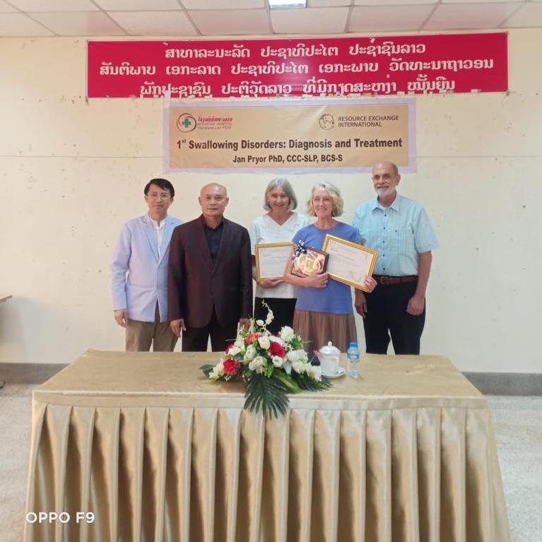 Jan Pryor, CCC-SLP, is a speech-language pathologist in our UW Oto Montlake clinic. She is also, among other things, on the board of the National Foundation of Swallowing Disorders, and she volunteers for Resource Exchange International, an NGO which sends people to countries for short-term training of medical personnel in various areas of medicine. She was recently recruited to go to Laos to train doctors and nurses how to assess and treat people with dysphagia (swallowing disorders). She delivered a two-day conference at Mittaphab Hospital. The hospital has just started a new stroke program, but many of the stroke patients die of aspiration pneumonia or suffer from dehydration and malnutrition related to dysphagia. This was their first training in dysphagia.